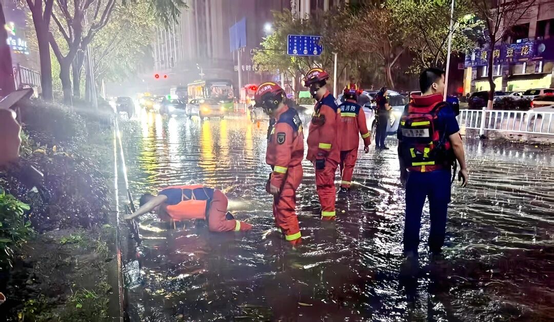 救援队伍疏通内涝道路。